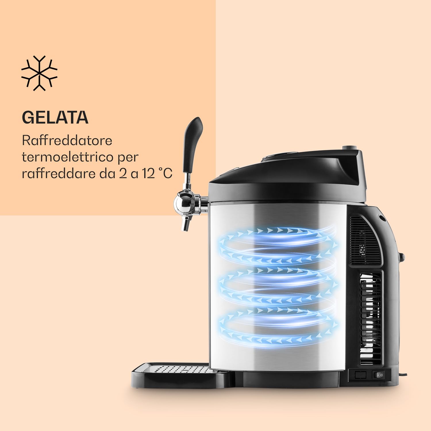 - RINFRESCO: Il dispositivo di raffreddamento dello spillatore è dotato di un'unità di raffreddamento integrata che funziona in modo silenzioso e mantiene la temperatura tra i 2 e i 12 ° C. Un display LED leggibile fornisce informazioni sulla temperatura.