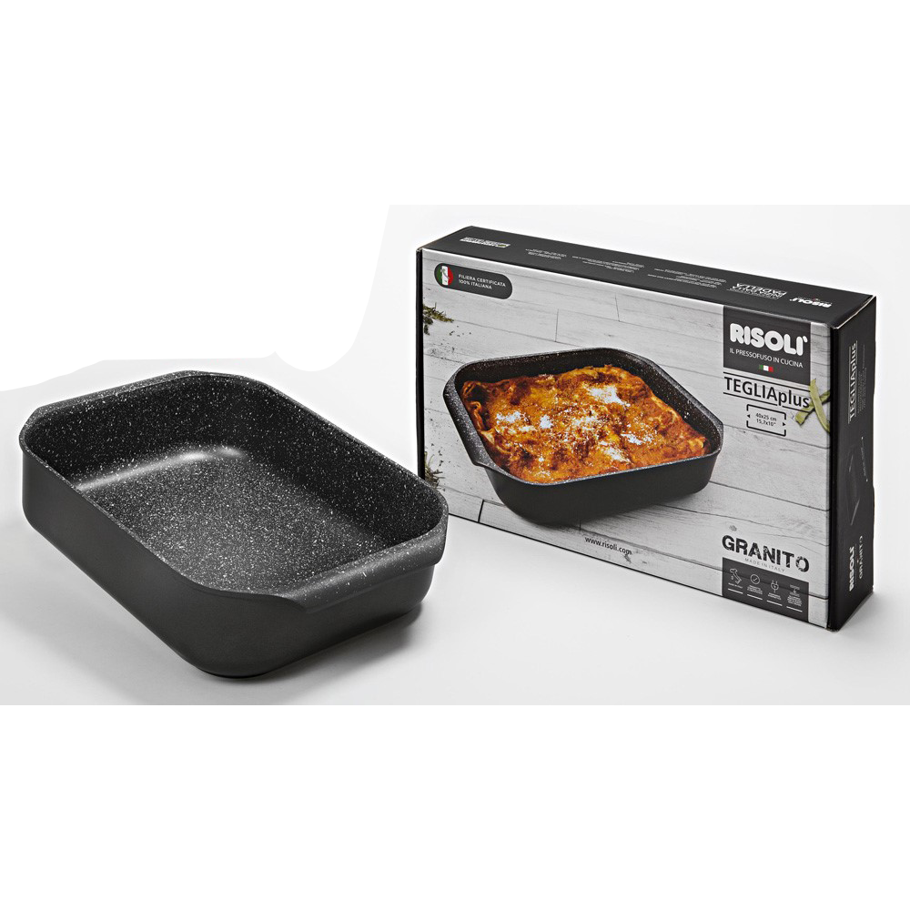 Realizzato dal brand Risolì, questa pentola è costituita interamente in alluminio pressofuso che ne aumenta inevitabilmente la durata e la resistenza, portandola a 30 µ. L'alluminio inoltre, essendo un ottimo conduttore elettrico, trasmette il calore permettendo una cottura uniforme. Questo prodotto sostiene inoltre l'ambiente attraverso l'assenza di PFOA al 100%, nickel free, e un rivestimento antiaderente. Quest'ultimo è al 100% in granito con la presenza di particelle di minerali, in modo tale da ridurre l'acqua necessaria ad effettuare una pulizia ottimale del prodotto. Adatto a tutti i piani cottura, la pentola Risolì può essere utilizzata su tutti i comuni piani cottura a gas, elettrici, in vetroceramica o può semplicemente essere riposto in forno.